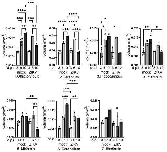 Quantitation of changes in volumes of different regions of the brain throughout development in uninfected (UI) and ZIKV-infected mice. P1 mice were left uninfected or ZIKV-infected, and at the time points indicated, whole heads were collected and subjected to diceCT. Images were rendered, and brain regions 1 (olfactory bulb), 2 (cerebrum), 3 (hippocampus), 4 (interbrain), 5 (midbrain), 6 (cerebellum), and 7 (hindbrain) were segmented as outlined in Figure 2, and volume quantitated. * p < 0.05, ** p < 0.01, *** p < 0.001, **** p < 0.0001, one-way ANOVA, Tukey’s multiple comparison test. # = unreliable due to loss of brain stem at sample collection.