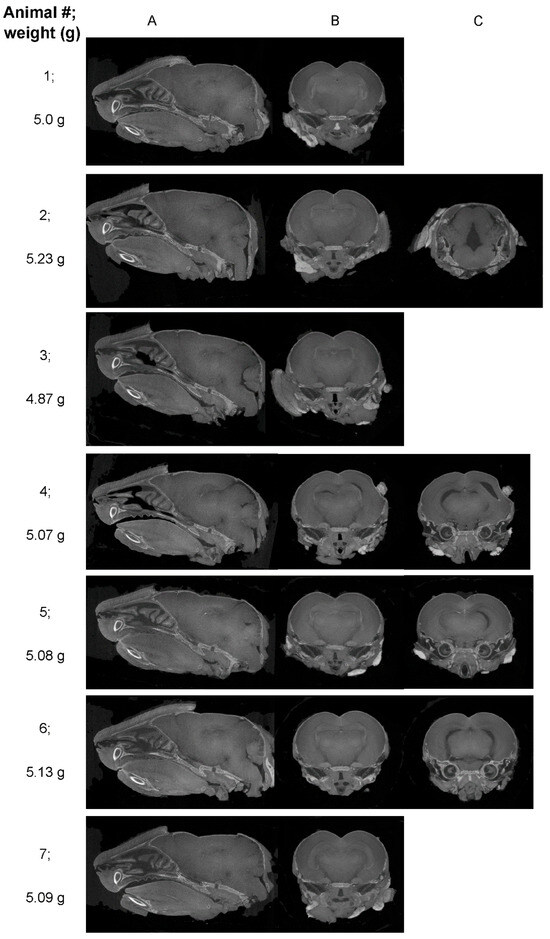Although quantitative brain measurements at 6 dpi were not significantly different between uninfected and ZIKV-infected animals, our qualitative analysis suggested that defects might be visually evident at this time point, although with diverse pathologies. Given this, the ability to utilise diceCT to visually or quantitatively identify ZIKV-infected animals in a blind cohort at 6 dpi before the disease is clinically overt was assessed. Neonatal P1 mice from a single litter were left uninfected (n = 3) or ZIKV-infected (n = 4) and, at 6 dpi, were subjected to diceCT analysis. Independent visual analysis of images by four reviewers with diverse expertise in virology and rodent neuroanatomy identified consistent morphological differences in animal numbers 2, 4, and 6 that penetrated multiple layers of the brain (Figure 4, Table 2). All reviewers identified animal number 1 definitively as uninfected. Three of the four authors identified animal 5 as ZIKV-infected but with some reservations, and similarly, animals 3 and 7 were deemed to be likely uninfected or presented some uncertainty (Table 2). Quantitative analysis was performed on segmented brain images, per Figure 2. In line with the blind ratings, animal 4 tended to reflect smaller measures in the interbrain, midbrain, and cerebellum. Brain volumes, however, were not significantly different across the cohort, and samples did not cluster well into two distinct groups that could suggest alignment with either uninfected or ZIKV-infected animals (Table 3). The biggest variability was observed at the level of the posterior hippocampus, interbrain, and midbrain, both visually and in the quantitative analysis. The identification of animals as uninfected or ZIKV-infected could not be resolved without sampling the brain tissue since ZIKV was undetectable by PCR from the body at this time point pi. Thus, we believe diceCT imaging could qualitatively identify most ZIKV-infected animals with some certainty but cannot quantitatively predict ZIKV infection in a blind cohort prior to the clinical presentation of the disease.