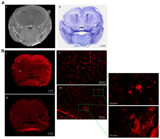 Post-diceCT tissue analysis. (A) (i) diceCT analysis; (ii) tissue was destained, embedded, and coronal sections from the midbrain analysed by Nissl staining; (B) (i) immunofluorescent analysis for Iba1; (ii) no antibody control; images were collected using a VS200 slide scanner. An optical zoom is shown at * in the hippocampus and ** the outer cortex from section (i), with a further zoom of regions as indicated by green dotted boxes and lines.