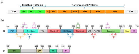 The humoral response by B cells appears shortly after HCV infection but is inadequate to fully control the infection. The neutralizing antibody (nAb) response targets the envelope glycoproteins (GPs) E1 and E2, although E1 is less immunogenic compared to E2 [46]. Most nAbs target E2 epitopes, followed by E1–E2 heterodimers and E1 glycoproteins. The GPs E1 (residues 192–383, shown in Figure 2) and E2 (residues 384–746, shown in Figure 2) are type I transmembrane proteins with poorly understood roles, but E1 harbors a putative fusion loop. The E1 and E2 proteins’ ectodomains each have five and eleven glycosylation sites, respectively [47]. The glycans are crucial for E1–2 stability and antigenicity.