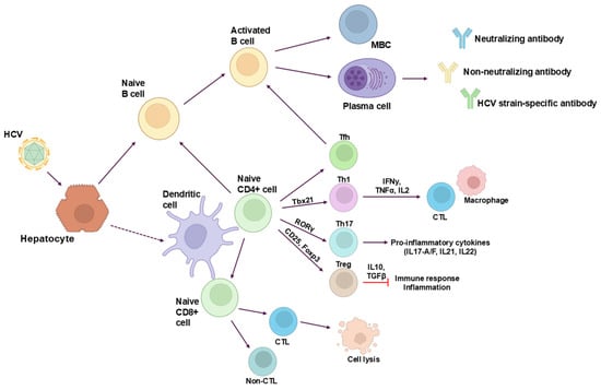 Adaptive immunity during HCV infection. Immune response involves activation of dendritic cells and other components of innate immunity, whereas B lymphocytes, CD4+ T cells, and CD8+ T cells are effectors of adaptive immunity. Abbreviations: Th1, T helper 1 cell; Th17, T helper 17 cell; Treg, T regulatory cell; Tfh, T follicular helper cell; MBC, memory B cell; CTL, cytotoxic lymphocyte. Created with BioRender.