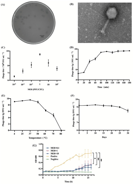 In the temperature stability test, the phage titer of the phage hardly changed at 4–50 °C. When the temperature was higher than 50 °C, the phage titer started to decrease, and when it reached 80 °C, the phage was completely inactivated (Figure 1E). At 37 °C, the phage titer started to decrease on day 20, and on day 30, the phage titer decreased by 0.75 orders of magnitude compared to the initial phage titer (Figure 1F).