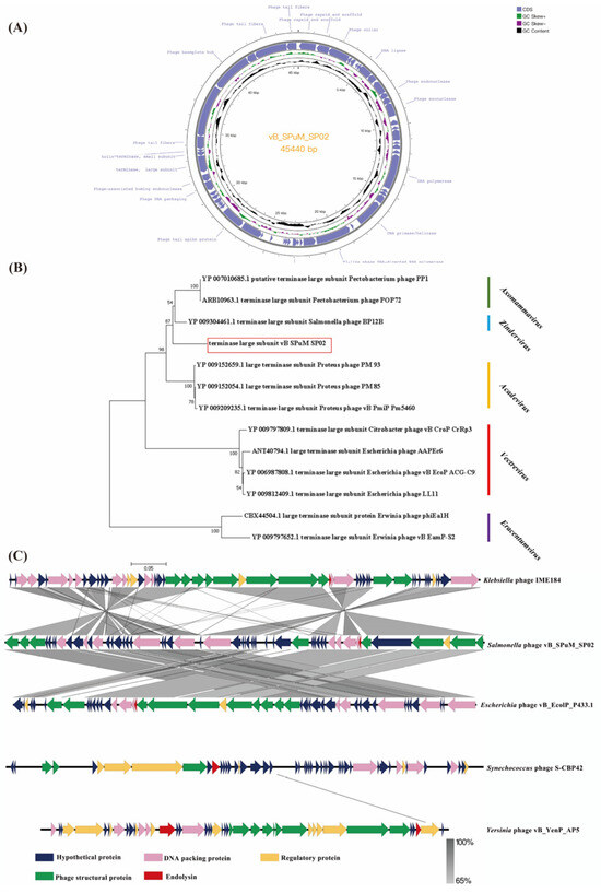 Phage SP02 whole genome analysis. (A) Genome map of phage SP02; the genome of phage SP02 was depicted as circular. The arrows represent 54 ORFs, among which 20 ORFs were predicted to have known function. In addition, the map shows GC skew and content about the genome. Note: unmarked ORFs in the graph are hypothetical proteins; (B) Phylogenetic analysis based on the sequences of large terminase subunit proteins from 13 phages using MEGA 7 with 1000 bootstraps. Red frame locates the phage SP02. All phages are from different genera of the subfamily Molineuxvirinae; (C) Comparative analysis of the whole genome of five phages. Blue arrows indicate hypothetical protein, other colored arrows indicate conserved proteins with homology.