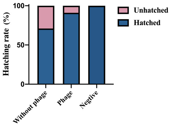 All breeding eggs were checked for normal development by day 18 of incubation. On day 21, chicks emerged from the shell, and the hatching rate of breeding eggs was 100% in the negative group, 91.11% in the phage group, and 71.11% in the without phage group (Figure 3).