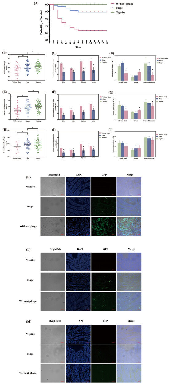 As shown in the results (Figure 4K–M), there was a significant decrease in the thymus index of chicks in the without phage group compared to the phage group on days 1–14 (p < 0.05). There was a significant increase in the spleen index of chicks in the without phage group compared to the with phage group on days 1–7 (Day 1 p < 0.01; Day 7 p < 0.05), although the increasing trend gradually slowed down and there was no statistical difference on day 14 (p > 0.05). There was a significant decrease in the fasciola bursa index in the phage-free group compared to the phage group on days 1–7 (p < 0.05), with no statistical difference on day 14 (p > 0.05).