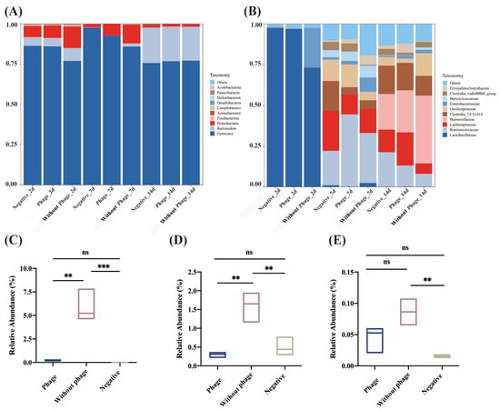 To further compare the changes in Salmonella abundance at the genus level within the gut microbiota, it was observed that on the 2nd and 7th days, there was a significant decrease (p < 0.01) in Salmonella relative abundance in the phage group compared to the without phage group. However, on the 14th day, the difference in relative abundance was not significant (p > 0.05) (Figure 5C–E).