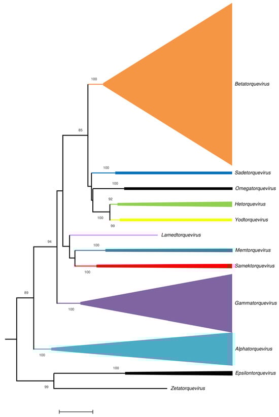 An overall phylogeny analysis of the database has been carried out using an amino acid alignment containing one representative sequence for each species using MAFFT for the alignment (v7.520) and MEGA X (v10.0.5) for the tree reconstruction with the Maximum Likelihood method and LG+G+I+F model []. According to this analysis, using the ICTV genera taxonomy, including the novel proposed genus Sadetorquevirus [], three species have been reassigned to different genera, one Omegatorquevirus to Betatorquevirus and two Hetotorquevirus to novel genus Sadetorquevirus.