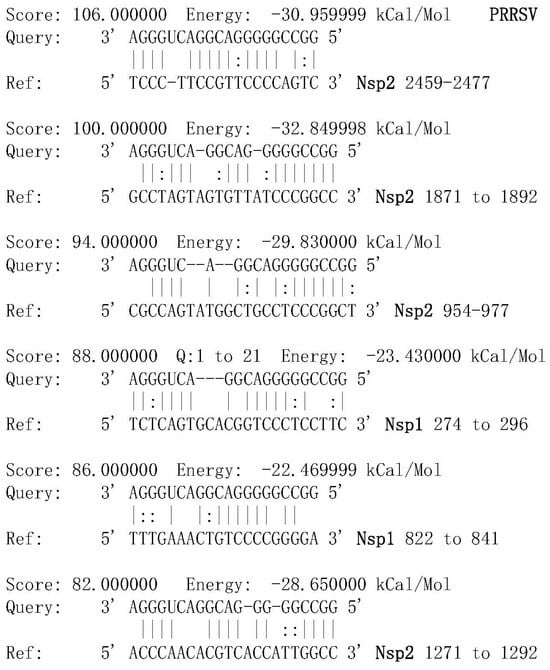 Prediction of miR2911 targeting PRRSV gene analysis (Note: “:” indicates base mismatch). Prediction of miR2911 targeting four regions of the PRRSV Nsp2 gene versus two regions of the Nsp1 gene using miRanda v1.0b software.
