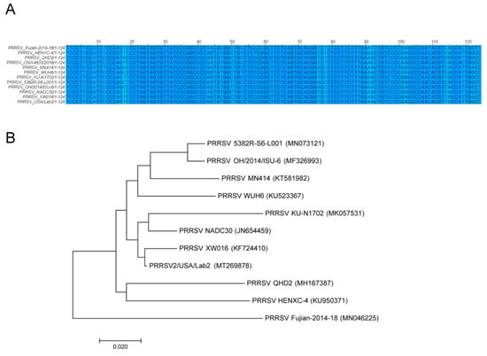 Evolutionary tree analysis of miR2911 targeting viral regions, targeting PRRSV genes with multi-region sequence evolutionary trees. (A) miR2911 sequences downloaded from the NCBI database targeting the PRRSV gene region, with light colors indicating genes with differences. (B) Construction of an evolutionary tree of miR2911 targeting viral gene regions using the neighborhood method in MEGA 7.0 software.