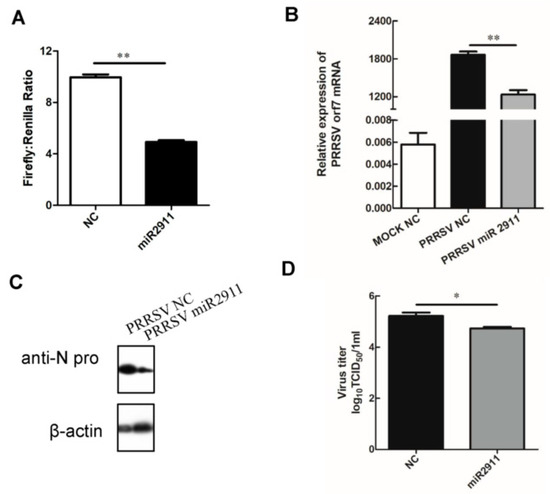 Overexpression of miR2911 inhibited replication of PRRSV via target viral gene regions. (A) HEK293T cells were co-transfected with luciferase reporter pGL3-promoter-PRRSV, pRL-TK, and miR2911 mimic or NC mimic; after transfection for 24 h, double luciferase reporter was detected. (B,C) miR2911 or NC was transfected into Marc-145 cells. After 24 h, the cells were infected with PRRSV at a MOI of 0.1 for 24 h. The mRNA and protein level of PRRSV orf7 was measured by qRT-PCR and Western blot, respectively. (D) The supernatants were collected at 24 h post-infection (hpi) for TCID50 assay. Data are presented as mean ± SEM pooled from one separated experiment; n ≥ 3 for each of the analyzed parameters. *, p < 0.05; **, p < 0.01.