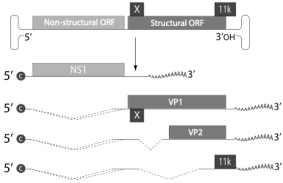 Representation of the genomic structure of the B19V genome (ViralZone https://viralzone.expasy.org, accessed on 1 Augst 2024).