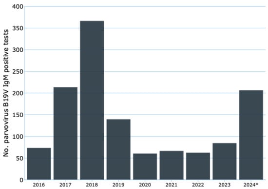 Parvovirus B19V IgM positive tests, 2016 to 2024 (* to end June 2024) [26,27].