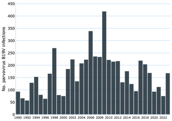 - Health Protection Surveillance Centre. Parvovirus B19 Epidemiological Data. 2024. Available online: https://www.hpsc.ie/a-z/other/parvovirus/epidemiologicaldata/ (accessed on 31 July 2024).