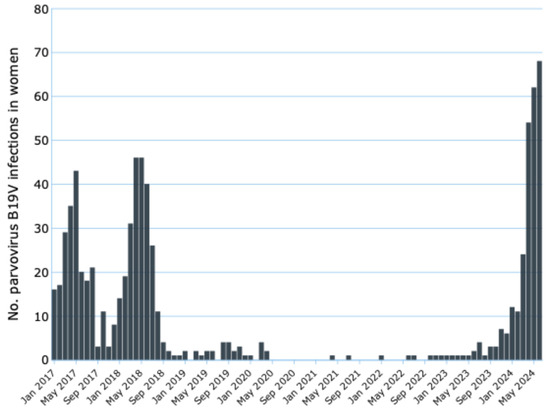 - Nordholm, A.C.; Møller, F.T.; Ravn, S.F.; Sørensen, L.F.; Moltke-Prehn, A.; Mollerup, J.E.; Funk, T.; Sperling, L.; Jeyaratnam, U.; Franck, K.T.; et al. Epidemic of parvovirus B19 and disease severity in pregnant people, Denmark, January to March 2024. Eurosurveillance 2024, 29, 2400299. [Google Scholar] [CrossRef]