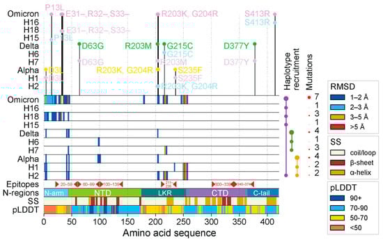 - Ali, M.A.; Caetano-Anollés, G. AlphaFold2 Reveals Structural Patterns of Seasonal Haplotype Diversification in SARS-CoV-2 Spike Protein Variants. Biology 2024, 13, 134. [Google Scholar] [CrossRef]