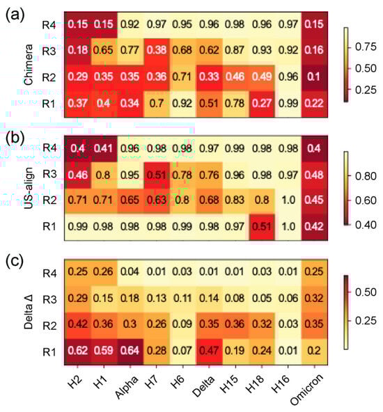 - Zhang, C.; Shine, M.; Pyle, A.M.; Zhang, Y. US-Align: Universal Structure Alignments of Proteins, Nucleic Acids, and Macromolecular Complexes. Nat. Methods 2022, 19, 1109–1115. [Google Scholar] [CrossRef]