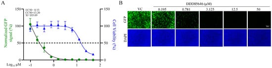 DDD85646, a validated potent and selective pan NMT inhibitor [13,40], exhibited a potent dose-dependent inhibitory effect on rLCMV/GFP-P2A-NP multiplication in A549 cells, with an EC50 value of 0.13 μM (effective drug concentration that reduced GFP expression to 50% when compared to that of vehicle-treated controls) (Figure 1). The inhibitory effect of DDD85646 on LCMV multiplication was not a consequence of drug-induced cell toxicity, as the CC50 (drug concentration that reduced cell viability by 50% when compared with that of vehicle-treated cells) of DDD85646 was >13 μM (Figure 1), resulting in a DDD85646 selectivity index (SI = CC50/EC50) of >100.