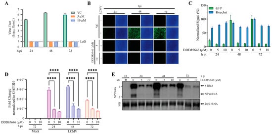 To examine the effect of DDD85646 on LCMV multi-step growth kinetics in A549 cells, we infected them with rLCMV/GFP-P2A-NP (MOI 0.05) and treated them with the indicated concentrations of DDD85646 or vehicle control (VC). At the indicated hours post-infection (h pi), we collected cell culture supernatant (CCS) samples and determined the virus titers using a focus-forming assay (FFA) (Figure 2A). Treatment with DDD85646 at either 10 or 5 µM resulted in the lack of detection of infectious LCMV progeny, which correlated with restricted LCMV propagation within the cell monolayer in the presence of DDD85646 (Figure 2B,C) and reduced levels of viral RNA synthesis as determined by RT-qPCR (Figure 2D). To assess whether treatment with DDD85646 could differentially affect the levels of LCMV replication and transcription, RNA samples from rLCMV/GFP-P2A-NP-infected (MOI 0.05) cells were analyzed by Northern blotting, using an NP-specific 32P-dsDNA probe that detects genome and antigenome S RNA species (replication) and NP mRNA (transcription). Treatment with DDD85646 resulted in reduced levels of virus replication and transcription at all the times examined, starting at 24 h pi (Figure 2E).
