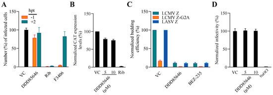 We also examined whether DDD85646 exerted any virucidal activity on infectious LCMV virions. Treatment of infectious LCMV virions (105 FFU) for 30 min at 37 °C with DD85646 at either 5 µM or 10 µM concentrations, which reduced the production of infections LCMV progeny by >5 logs (Figure 2B), did not significantly affect virion infectivity, whereas treatment with 0.5% NaOCl under the same conditions resulted in a complete loss of infectivity (Figure 3D).