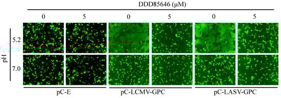 HEK293T cells were plated on poly-L-lysine-treated 24-well plates (2.5 × 105 cells/well). The next day, the cells were transfected with a pCAGGS plasmid expressing GFP protein (50 ng/well), along with either an empty pCAGGS plasmid or pCAGGS plasmids expressing LCMV GPC or LASV GPC proteins (1 µg/well). Lipofectamine 3000 reagent was used for the transfection according to the manufacturer’s protocol. Cells were incubated with the transfection mixture for 5 h, washed once with media, and then replaced with media with or without DDD85646 (5 µM). At 24 h post-transfection, the cells were treated with acidified (pH 5) or neutral (pH 7.2) media for 15 min followed by a wash with DMEM, and then they were returned to DMEM containing 10% FBS and monitored over time for the appearance of syncytia using a fluorescence microscope. Cells were fixed with 4% PFA, washed with DPBS, and imaged at 20× magnification using a Keyence BZ-X710 microscope.