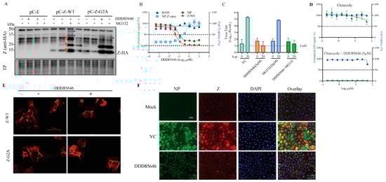 Effect of DDD85646 on Z expression levels and subcellular distribution. (A) HEK293T cells were seeded (4 × 105 cells/M6-well) and transfected 16 h later with pCAGGS empty (pC-E), Z wild type (pC-Z-WT) or Z (G2A) (pC-Z-G2A) plasmids. At 24 h post-transfection, the cells were treated with DDD85646, MG132, or both, and at 24 h post-treatment, cell lysates were prepared and protein expression examined by Western blotting. Red arrows indicate Z protein oligomers; blue circles indicate Z protein-specific associated bands. (B) A549 cells were plated on 96-well clear-bottom plates (4.0 × 104 cells/well). Sixteen hours later, the cells were infected with rLCMV/Z-HA (MOI 1), and serial dilutions (3-fold) of DDD85646 were added to cells, starting at 10 μM. At 72 h after the drug treatment, the cells were fixed with 4% PFA and stained with fluorescent antibodies for signal quantification; each point represents the mean of four biological replicates. (C) A549 cells were infected (MOI = 0.1) with rLCMV/GFP-P2A-NP. After a 90 min adsorption, the inoculum was removed, the cells were washed once, and medium containing either MG132 (20 µM), DD85646 (5 µM), or MG132 + DDD85646 was added to the cells. Cell culture supernatants were collected at 0 (after adsorption) and 24 h post-infection, and virus titers were determined by the FFA. (D) A549 cells were seeded at 4 × 104 cells/well into a 96-well plate, infected with rLCMV/GFP-P2A-NP (MOI 0.05), and treated with incremental doses of clemizole or with clemizole in the presence of 5μM DDD85646. At 72 h pi, the cells were fixed, and the number of infected cells was determined by IF. (E) HEK293T cells were plated on poly-L-Lysine 96-well clear-bottom optically treated plates (2.0 × 104 cells/well). The next day, the cells were transfected with LCMV Z-HA or the Z-G2A-HA mutant. At 24 h post-transfection (h pt), the media was replaced with DDD85646 (5 μM)-containing media, and at 48 h after drug treatment, the cells were fixed with 4% PFA. Images were taken using a Keyence BZX-710 microscope at 20× magnification, which were then zoomed in digitally to 1.5× magnification. The images were subjected to the Point–Spread Function (PSF) and then deconvolved using DeconvolutionLab2 (Fiji ImageJ, v154) with the following setting: Iterative Constraint Tikhonov–Miller algorithm at 100 iteration N, 1 step γ, and low reg. λ. (F) A549 cells were plated on 96-well clear-bottom optically treated plates (2.0 × 104 cells/well). The next day, the cells were infected with rLCMV/Z-HA (MOI 0.05) and treated with DDD85646 (5 μM)-containing media 90 min later. At 72 h after drug treatment, the cells were fixed with 4% PFA and co-labeled with anti-HA (Z) and anti-NP antibodies and with DAPI for DNA; the Z protein is red, NP is green, and DNA is blue. The images have been zoomed in digitally to 3× magnification.