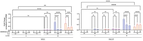 Effect of DDD85646 on the expression of ISGs. A549 cells were seeded at 2 × 105 cells/well in an M12-well plate, infected with LCMV/GFP-P2A-NP (MOI 0.05), and treated with DDD85646 (5 or 10 µM) or with VC. At the indicated time points, total cellular RNA was isolated and analyzed by RT-qPCR (10 ng/sample; three technical replicates). The RT step was performed using random hexamers, followed by quantitative PCR with specific primers for ISGs MX1, or ISG15 and the cell housekeeping gene GAPDH. MX1 and ISG15 fold changes were normalized to GAPDH. The repeated-measures analysis of variance with mixed-effect analysis and Dunnet’s correction for multiple comparisons were used. Statistically significant values: ns p > 0.05, * p ≤ 0.05, ** p < 0.01, *** p < 0.001, **** p < 0.0001.