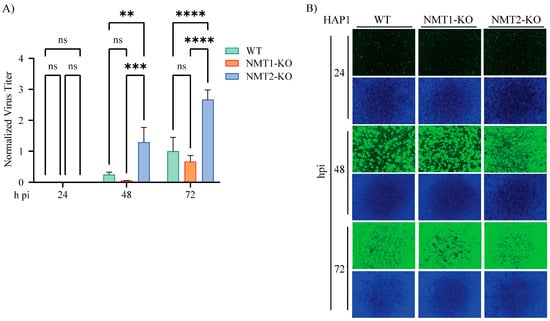 Contribution of NMT1 and NMT2 isozymes to LCMV multiplication. HAP1 NMT WT, NMT-1-KO, or NMT-2-KO cells were seeded at 2 × 105 cells/well in an M12-well plate and infected with LCMV/GFP-P2A-NP (MOI 0.05). At the indicated time points, CCS was collected for virus titration. Virus titers were normalized to titers at 72 h pi in the VC-treated sample, which was assigned the value of 1 (A), and the cells were fixed for immunofluorescence imaging (B). The repeated-measures analysis of variance with mixed-effect analysis and Tukey’s correction for multiple comparisons were used. Statistically significant values: ns p > 0.05, * p ≤ 0.05, ** p < 0.01, *** p < 0.001, **** p < 0.0001.