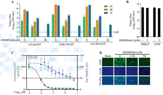 Effect of DDD85646 on the multiplication of the mammarenaviruses JUNV, TCRV, ML29, and LASV, and the flavivirus ZIKV. (A) A549 cells were infected with the indicated mammarenavirus and treated with DDD85646 (5 or 10 µM) or VC. At the indicated h pi, titers of infectious virus in the cell culture supernatants were determined by the FFA. (B) A549 and BHK21 cells were seeded into M24-well plates at a density of 1 × 105 cells/well and infected with ZIKV (MOI 0.1) for 1 h, then treated with DDD85646 (5 µM). At 24 h pi, supernatants were collected, and virus titers were determined by the FFA. Titers of technical duplicates were log-transformed and plotted as the mean ± SD (error bars). (C) A549 cells were seeded at 4 × 104 cells/well into a 96-well plate, infected with r3LASV/GFP (MOI 0.05), and treated with DDD85646 at the indicated concentrations. At 72 h pi, the cells were fixed, and the numbers of infected cells were determined by immunofluorescence. Numbers of infected cells were normalized to those of vehicle control (VC)-infected cells and expressed as a % of infected cells (viral infection). Cell viability was estimated based on the signal of DAPI staining. Results show the percentage of infected cells (four biological replicates). EC50 and CC50 values were calculated using a variable slope (based on four parameters) model (Prism10). Results show the mean and SD of four replicates. Representative immunofluorescence images of the dose-response assay of selected doses of DDD85646 are shown (D).