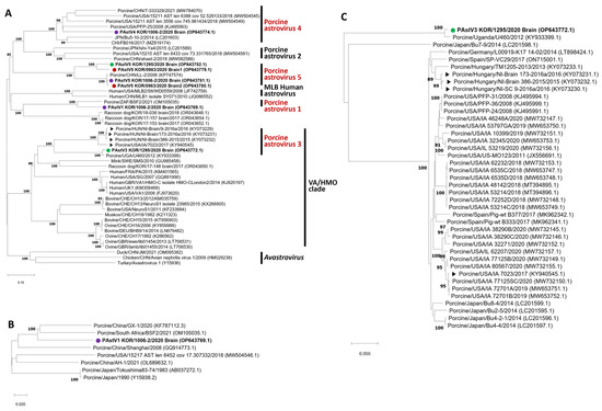 Partial RdRp sequences of PAstV were successfully amplified using a heminested PCR from brain tissue samples of four pigs, except the 20-0983-02 pig. The possibility of co-infection of multiple genotypes of PAstV was suggested by partial RdRp sequence analysis. ORF2 sequence analysis from three pigs identified the presence of PAstV genotypes 1, 3, 4, and 5 with multiple genotypes coexisting within 20-1006-2 and 20-1295 (Table 2). In South Korea, the prevalence of PAstV in domestic pigs was reported to be 20.1% and 9.2% in wild boars [38,40]. PAstV4 was dominant (94.6%) in swine, with a few PAstV2 present (5.4%) [38,39,40]. The detection of PAstV1, 3, and 5 genotypes represents the first detection in South Korea in this study. Six sequences including complete capsid protein encoded ORF2 sequence with lengths ranging from 2247 to 2937 nucleotides and one sequence (PAstV4 KOR/1006-2/2020 Brain (OP643774)) with partial ORF2 sequence with a length of 3104 nucleotides were obtained. A phylogenetic tree (Figure 1A) was constructed with PAstV genotypes 1–5, Avastroviruses 1–3, and reported Ni-AstV and PAstV using ORF2 amino acid sequences. Seven sequences obtained from brain samples of Korean pigs were closely related to known PAstV genotypes 1, 3, 4 and 5. PAstV 1, 4, and 5 were classified into the Mmastrovirus genogroup I, along with the MLB clade. PAstV3, on the other hand, was classified into genogroup II with the VA/HMO clade, which included the majority of Ni-AstV strains.