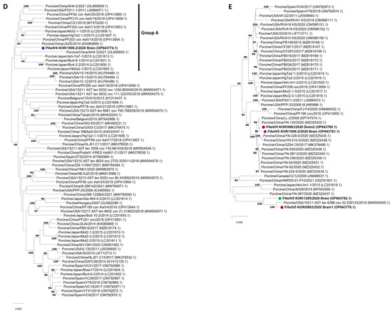 Carcasses of five pigs with neurological signs (astasia, knuckling, and pedaling with hind limb stretching) from three farms were submitted to Jeonbuk National University Veterinary Diagnostic Center (JBNU-VDC) from August to September 2020. The pigs ranged in age from 4 to 8 weeks, including both suckling and weaned piglets, with symptoms primarily appearing among littermates. The main symptom observed was the inability to stand; affected piglets that had fallen over would repeatedly exhibit paddling movements but were unable to rise easily. Case numbers 20-0983 and 20-0932-1 (8-week-old) and 20-1295 (4-week-old) pigs were from farms in Jeongeup, Jeollabuk-do, Korea. The pig with case number 20-1006-1 and 20-1006-2 (4-week-old) was from a farm located in Hamyang, Gyeongsangnam-do, Korea. Each case exhibited a sporadic outbreak pattern within the farm, with several instances of mortality observed. The specimens were transported immediately after the animals were slaughtered for prompt examination. Autopsy was conducted for each pig on different days. Tissue samples from various parts of the central nervous system, including cerebrum and cerebellum and spinal cord, were collected from each pig. These tissues were stored at −80 °C until further study or fixed in 10% neutral buffered formaldehyde to prepare formalin-fixed paraffin-embedded (FFPE) blocks.