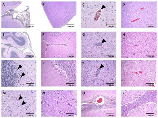 Tissue sections of brain (A–J,O,P) and spinal cord (K–N) stained with hematoxylin and eosin (A,C,E,G,I,K,M; 20-0983. O,P; 20-1295. B,D,F,H,J,L,N; negative control (NC)). (A,O) Cerebrum with meningitis and (B) NC; (C) cerebrum with perivascular cuffing (black arrowhead) and (D) NC; (E,P) cerebellum with meningitis and (F) NC; (G) cerebellum with perivascular cuffing (black arrowhead) and (H) NC; (I) Purkinje cell necrosis and degeneration of cerebellum (black arrowhead) and (J) NC; (K) spinal cord with perivascular cuffing (black arrowhead) and (L) NC; (M) necrosis and degeneration of neurons of spinal cord (black arrowhead) and (N) NC. Scale bar, 500 μm (A,B,E,F), 200 μm (N), and 100 μm (C,D,G–N,P).