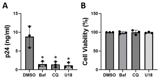 Bafilomycin A1, chloroquine, and U18666A inhibit HIV-1 replication in Jurkat cells. For virus replication (A), cells were pretreated with the drugs for 2 h and then infected with HIV-1NL4.3 (4 ng of p24/2 × 105 cells) in the presence of the drugs. The levels of HIV-1 Gag (p24) released in the media were determined using a standard ELISA assay at 4 days post-infection. Bafilomycin A1 (Baf), 5 nM. Chloroquine (CQ), 20 μM. U18666A (U18), 20 µM. DMSO, 0.1% (v/v). Cell viability (B) was measured using the MTS assay (Promega) after treating Jurkat cells with the drugs for 48 h. Values relative to the DMSO control (100%) are shown. Data are means ± SD (n = 3). * p < 0.05.