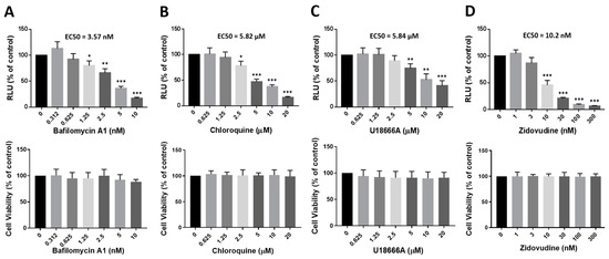 Dose-dependent inhibition of HIV-1 by bafilomycin A1, chloroquine, and U18666A. TZM-bl cells were pretreated with bafilomycin A1 (A), chloroquine (B), U18666A (C), or zidovudine (D) at the concentrations indicated for 2 h and then infected with HIV-1NL4.3 (2 ng of p24/2 × 105 cells) in the presence of the drugs. At 48 h post-infection, infectivity was determined using a luciferase assay (Promega); the relative light unit (RLU) relative to the DMSO control (100%) is shown. Cell viability was measured using an MTS assay (Promega); the cell viability relative to the DMSO control (100%) is shown. EC50 values were calculated by a nonlinear regression analysis using GraphPad Prism. Data are means ± SD (n = 3). * p < 0.05; ** p < 0.01; *** p < 0.001.