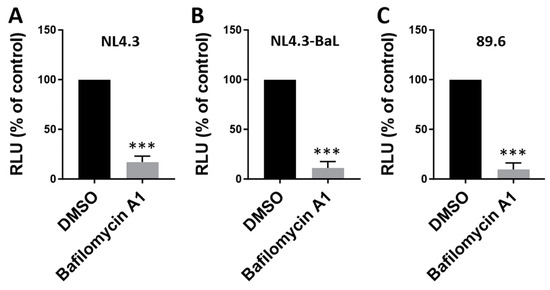 Next, we determined whether the antiviral activity of bafilomycin A1 is linked to the use of a particular coreceptor by different HIV-1 strains. To test this possibility, we produced three types of HIV-1 in HEK293T cells by transfecting full-length infectious HIV-1 clones. The CXCR4-tropic virus (NL4.3) was produced using pNL4-3 [24]. The CCR5-tropic virus (NL4.3-BaL) was produced using p81A-4 [25,26,27,28], a full-length clone containing the V1–V3 envelope regions of the CCR5-tropic strain BaL in the NL4-3 background. The dual-tropic virus (89.6) capable of using both CXCR4 and CCR5 was produced using p89.6 [29,30,31]. We then tested the impact of bafilomycin A1 treatment on infections with the three HIV-1 strains in TZM-bl cells. Our data show that bafilomycin A1 efficiently inhibits infections with the viral strains with different coreceptor tropisms (Figure 3). Taken together, our findings suggest that bafilomycin A1 inhibition of HIV-1 is independent of coreceptor tropism.