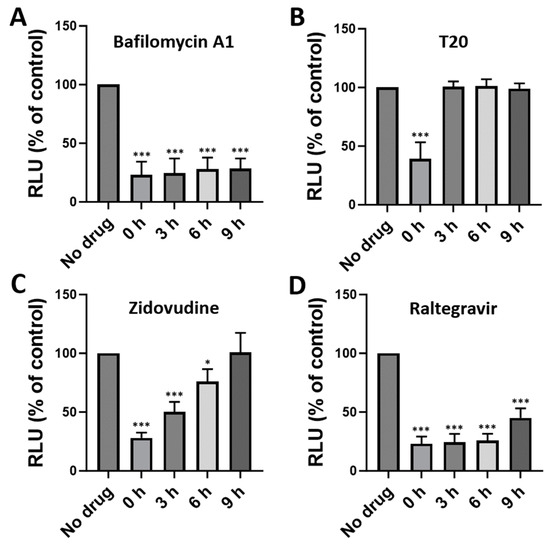 The antiviral activities of bafilomycin A1 (A), T20 (B), zidovudine (C), and raltegravir (D) in a time-of-addition assay. TZM-bl cells were infected with HIV-1NL4.3 (2 ng of p24/2 × 105 cells) with the drugs added at the indicated times. At 48 h post-infection, infectivity was measured using a luciferase assay. Bafilomycin A1, 5 nM; T20, 0.5 μM; zidovudine, 0.5 μM; raltegravir, 0.5 μM. RLU; relative light unit. Data are means ± SD (n = 3). * p < 0.05; *** p < 0.001.