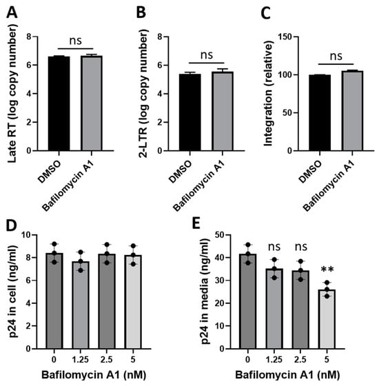 Effects of bafilomycin A1 on reverse transcription, nuclear import, integration, and virus particle production. (A–C) Jurkat cells were pretreated with bafilomycin A1 (5 nM) for 2 h and then infected with HIV-1NL4.3 (4 ng of p24/2 × 105 cells) in the presence of bafilomycin A1 (5 nM). At 24 h post-infection, total DNAs were isolated and the levels of late reverse transcription (RT) products (A), 2-LTR circles (B), or integration products (C) were determined using qPCR analysis. (D,E) HEK293T cells were transfected with the proviral molecular clone pNL4-3 plasmid. At 4 h post-transfection, cells were washed and incubated in fresh media in the absence or presence of bafilomycin A1. At 28 h post-transfection, the levels of HIV-1 Gag (p24) in cells (D) and in the culture media (E) were determined using a standard ELISA assay. Data are means ± SD (n = 3). ** p < 0.01. ns, non-significant.