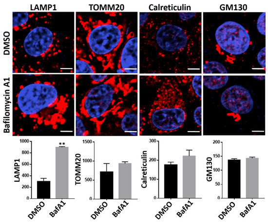 Bafilomycin A1 is a specific inhibitor of the V-ATPase, an ATP-dependent proton pump, that is present in eukaryotic cellular membranes including the endosomes and lysosomes [20]. Given its ability to target the V-ATPase in lysosomes, we anticipated that treatment of cells with bafilomycin A1 may affect lysosome structure and/or functions. To address this possibility, we examined the changes in cellular organelles that are induced upon bafilomycin A1 treatment. We treated TZM-bl cells with bafilomycin A1 for 48 h. We then stained cells with antibodies specific for lysosomes, mitochondria, the endoplasmic reticulum, and the Golgi apparatus, and analyzed cells using confocal microscopy (Figure 6). Interestingly, the treatment with bafilomycin A1 caused an increase in the intensity of lysosomes but did not exert a significant impact on the intensities of mitochondria, the endoplasmic reticulum, and the Golgi apparatus. These results suggest that bafilomycin A1 treatment causes an increase in the number and/or size of lysosomes. These alterations in lysosome structures may reflect cellular responses to the stresses that arise under conditions of bafilomycin A1 treatment.