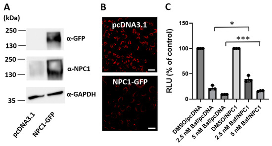 As bafilomycin A1 caused the accumulation of cholesterol in lysosomes (Figure 7), we determined whether the blockage of lysosomal cholesterol trafficking is linked to the inhibition of HIV-1 infection under conditions of bafilomycin A1 treatment. Niemann–Pick type C 1 (NPC1) is a lysosomal membrane protein that is responsible for the export of unesterified cholesterol from the lysosomes [35]. We transiently expressed NPC1-GFP in TZM-bl cells and then tested the impact NPC1-GFP expression on HIV-1 infection under conditions of bafilomycin A1 treatment. As expected from the role of NPC1 in cholesterol transport, NPC1-GFP expression (Figure 8A) caused a reduction in intracellular cholesterol accumulation (Figure 8B) under conditions of bafilomycin A1 treatment. Furthermore, overexpression of GFP-NPC1 partially relieved bafilomycin A1 inhibition of HIV-1 infection (Figure 8C). Collectively, these results suggest that cholesterol trafficking across the lysosomal compartments plays a role for HIV-1 infection.