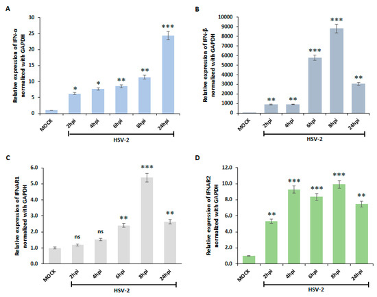 Activation of Interferon Pathway during HSV-2 Infection. Relative expression levels of type I interferon (A) IFN-α and (B) IFN-β, and their receptors (C) IFNAR1 and (D) IFNAR2 mRNA in macrophages during HSV-2 infection (MOI 1) compared to mock-infected controls at various time points (2, 4, 6, 8, and 24 hpi), as determined by quantitative Reverse Transcription-Polymerase Chain Reaction (qRT-PCR) analysis. Gene expression levels were normalized to GAPDH. Results are presented as the means and standard deviations from three independent experiments. ns, nonsignificant; *, p < 0.05; **, p < 0.01; ***, p < 0.001.