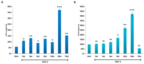 To validate the results of gene expression analysis, ELISA was performed to check the expression of type I interferons after infection with HSV-2. Remarkably, the secreted levels of both interferons (IFN-α and IFN-β) exhibit a gradual increase over the time following HSV-2 infection, with a statistically significant surge observed from 8 h post-infection onwards, with the highest levels of expression observed at the later time points from 24 hpi to 48 hpi and downregulation in their expression after 48 hpi (Figure 2A,B). While both IFN-α and IFN-β displayed similar expression patterns, the release of IFN-β was significantly higher in HSV-2-infected medium compared to IFN-α. Our result revealed the levels of IFN-α and IFN-β mRNA increased over time after HSV-2 infection, and their protein expression reached the highest levels at the later time points of 24 hpi, and 48 hpi, and reduced at 72 hpi.