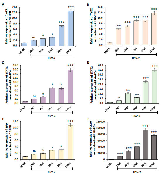Expression of JAK-STAT pathway during HSV-2 infection. THP-1 cells were infected with 1 MOI of HSV-2 at different time points (2, 4, 6, 8, and 24 hpi). The mRNA expressions of (A) JAK1, (B) TYK2, (C) STAT1, (D) STAT2, and (E) IRF9 were assessed at different time points of HSV-2 infection and were compared to mock. (F) HSV-2 UL30 expression was examined to determine the viral infection. Results are presented as the means and standard deviations from three independent experiments. ns, nonsignificant; *, p < 0.05; **, p < 0.01; ***, p < 0.001.