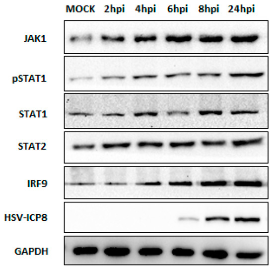 To validate the results of qPCR, we performed Western blot analysis to evaluate the protein expression levels of key JAK-STAT pathway components in THP-1 cells infected with HSV-2 at different time points, in comparison with the mock-infected group (Figure 4). The analysis revealed increased protein expression of JAK1, phosphorylated STAT1 (p-STAT1), total STAT1, and STAT2 over time following HSV-2 infection, with the highest expression observed at 24 hpi (Figure 4). As the mRNA level of the genes of the JAK-STAT pathway rises from the initial time points of infection, it is possible that the translation process starts earlier, and the peak level of protein expression observed at 24 hpi could be a cumulative result of the translational process that began earlier, after the initial mRNA induction. Similarly, IRF9, a component of the ISGF3 complex, also showed an increasing trend in its protein level over time after HSV-2 infection, further supporting the activation of the JAK-STAT pathway in response to HSV-2 infection, and the potential formation of the ISGF3 complex (Figure 4). Despite the induction of the antiviral response, the levels of the HSV-2 ICP-8 protein, a key viral protein involved in viral replication, exhibited a significant increase at later time points (Figure 4). This observation suggests that HSV-2 employs mechanisms to counteract the host antiviral defenses and facilitate its replication process.