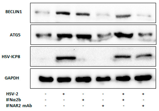 It is well established that type I interferon is responsible for the activation of autophagy in many cell types [22]. Therefore, to elucidate whether type I interferon is involved in the induction of autophagy upon HSV-2 infection, we checked the protein expression level of key autophagy components, BECLIN1 and ATG5 in IFN-α2B alone or in combination with HSV-2, compared to mock- or only virus-infected conditions at 24 hpi (Figure 6). The protein expression levels of these autophagy markers in IFN-α2B-treated cells were found to be similar to those observed in HSV-2-infected cells (Figure 6). Notably, the protein expression levels were further augmented in cells co-treated with IFN-α2B and HSV-2, compared to mock-infected, HSV-2-infected, or IFN-α2B-treated cells alone. The protein expression of these autophagy markers, including BECLIN1, involved in autophagy initiation, and ATG5, involved in autophagosome formation, was inhibited upon treatment with an IFN inhibitor (IFNAR2 mAb) compared to HSV-2-infected cells (Figure 6). IFNAR2 mAb neutralizes the human IFN-α receptor by interacting with its extracellular domain, binding with high affinity and blocking the biological action of Type I IFNs. Inhibition of these autophagy markers was significantly more pronounced when HSV-2-infected cells were treated with IFN inhibitor, compared to HSV-2-infected or IFN inhibitor alone, highlighting the probable crosstalk between type I interferon and autophagy during HSV-2 infection. These proteins are crucial components of the autophagy machinery, suggesting that HSV-2 infection triggers the induction of the autophagic pathway via type I interferon signaling. Despite the activation of type I interferon-induced autophagy, the expression level of the viral protein ICP-8 increased over time, which indicates that the HSV-2 can modulate the type I interferon-induced autophagy for its survival.