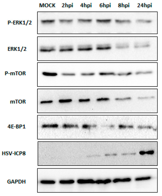 The MAPK/ERK1/2 signaling pathway is known to restrict autophagy by activating mTOR [33]. However, the regulatory mechanisms governing the type I interferon-induced autophagic response during HSV-2 infection had not been fully explored. Therefore, we assessed the levels of p-ERK1/2 (p-p44/42 MAPK), ERK1/2 (p44/42 MAPK), p-mTOR, mTOR, and the mTOR downstream regulator 4E-BP1 at different time points (2–24 hpi) of HSV-2 infection (Figure 7).