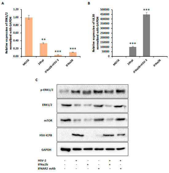 To elucidate the mechanism by which type I IFN induces autophagy, we investigated the roles of ERK1/2 and mTOR upon HSV-2 infection. THP-1 cells were infected with HSV-2 and examined at 24 hpi, a time point when type I IFN expression is maximal, leading to an increase in autophagy. These cells were compared to cells treated with IFN-α2B alone and cells co-treated with IFN-α2B and HSV-2. Our data revealed that HSV-2-infected cells exhibited a 66.3% inhibition of ERK1/2 mRNA expression, whereas overexpression of type I interferon downregulated ERK1/2 mRNA expression by 89.4%. Furthermore, cells co-treated with IFN-α2B and HSV-2 showed a 96.4% inhibition of ERK1/2 mRNA expression, indicating that HSV-2 infection downregulates ERK1/2 mRNA expression through type I interferon signaling (Figure 8A). Effective viral infection was confirmed by examining HSV-2 UL30 expression from the same samples (Figure 8B).
