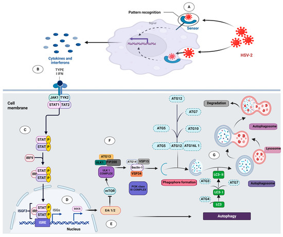 Schematic representation of the key signaling pathways involved in the initiation of autophagy upon HSV-2 infection: (A) Upon entry into the host cell, HSV-2 is recognized by pattern recognition receptors, which detect pathogen-associated molecular patterns, leading to the activation of inflammatory pathways and the production of cytokines and interferons [35]. (B) Type I interferons (IFN-α/β) bind to their respective receptors (IFNAR1/2), triggering the activation of the Janus kinase/signal transducer and activator of transcription (JAK/STAT) pathway [36]. (C) The JAKs (JAK1 and TYK2) phosphorylate STAT1 and STAT2, which subsequently form a heterotrimeric complex with IRF9, known as the IFN-stimulated gene factor 3 (ISGF3). This complex translocates to the nucleus and binds to IFN-stimulated response elements (ISREs) in the promoter regions of IFN-stimulated genes (ISGs), inducing their transcription [31]. (D) Among the ISGs, the suppressor of cytokine signaling (SOCS) proteins are produced, which interact with and inhibit components of the Ras–Raf–MEK–ERK cascade, leading to the inhibition of ERK1/2 [37]. (E) The inhibition of ERK1/2 results in the downregulation of the mechanistic target of rapamycin complex 1 (mTORC1), a critical regulator of cellular processes, including autophagy [38]. (F) The inhibition of mTORC1 triggers the initiation of autophagy through the activation of the ULK1 complex, comprising ULK1, ATG13, FIP200, and ATG101 [39]. (G) The autophagy-related genes (ATGs) are activated, leading to the formation of the phagophore and the eventual maturation of the autophagosome, which ultimately fuses with the lysosome to complete the autophagic process [40].