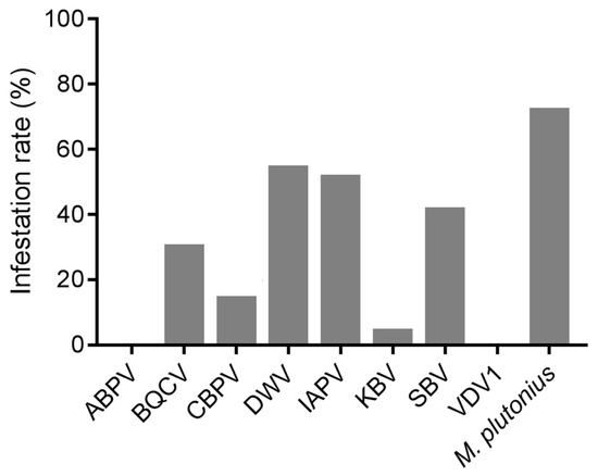 - Tentcheva, D.; Gauthier, L.; Zappulla, N.; Dainat, B.; Cousserans, F.; Colin, M.E.; Bergoin, M. Prevalence and seasonal variations of six bee viruses in Apis mellifera L. and Varroa destructor mite populations in France. Appl. Environ. Microbiol. 2004, 70, 7185–7191. [Google Scholar] [CrossRef]