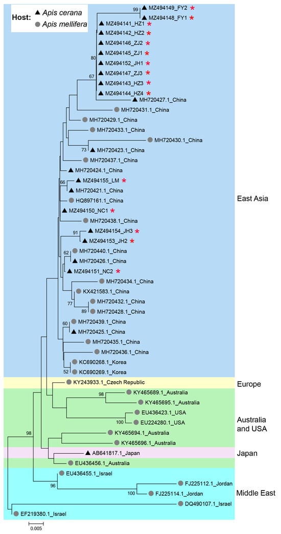 Phylogenetic tree illustrating the genetic relationship of IAPV isolates from different countries and different hosts. The sequences obtained in this study were indicated by red asterisks (*). Numbers at each node represent bootstrap values as percentages of 100; only bootstrap values greater than 50% are shown.