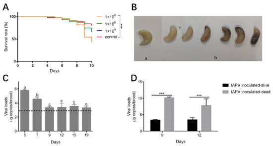 The mortality rate of the brood inoculated with IAPV at titers of 1 × 104 and 1 × 105 genome copies/uL was relatively higher, but not significantly different from those of the control group (Kaplan–Meier test, p = 0.184 and p = 0.244, respectively). However, when inoculated with high titers of IAPV (1 × 106 genome copies/uL), high mortality occurred at day 9 at the prepupae stage (Kaplan–Meier test, p < 0.001) (Figure 4A). The dead brood appeared dark brown or milky white, some showing fluid accumulation under the skin or developmental malformations (Figure 4B). These symptoms are similar to those observed in the diseased larvae we collected. The viral load of the survival brood decreased significantly from day 5 to day 9 (Tukey’s post hoc test, p < 0.05) (Figure 4C). Meanwhile, the viral loads of dead brood collected on day 9 and day 12 were significantly higher than those of survived brood at the corresponding day ages (one-way ANOVA analysis, p < 0.001) (Figure 4D).