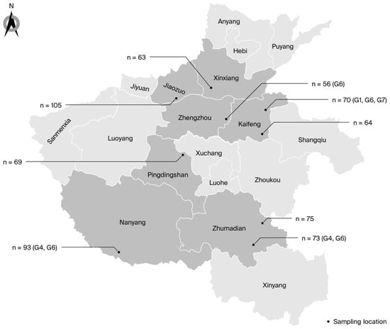 Map showing the distribution, sample sizes, and genotypes of BLV in Henan. “n” represents the total number of samples; “Gx” represents the genotypes identified at each farm.